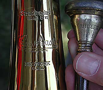 Glenn's spare trombone and engraved mouthpiece in Clarinda.